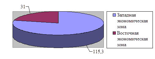Рисунок 1 – Показатели площади Западной и Восточной экономических зон, тыс.км2
