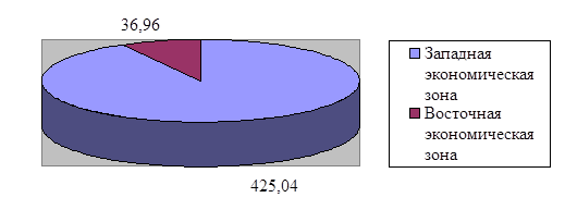 В специализации Восточной экономической зоны выделяются отрасли сырьевой составляющей: топливная промышленность (газ, нефть, уголь, уран), поэтому неудивительно, что по производству нефти Восточная экономическая зона занимает большой удельный вес – 451,36 млн.тонн. Западная экономическая зона производит – 44,64 млн.тонн.