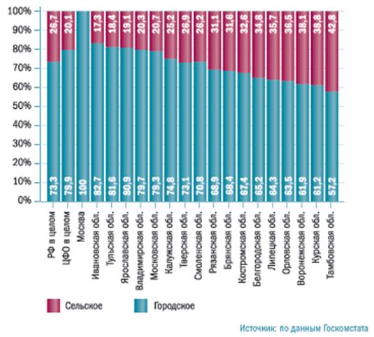 Характерная черта Центрального федерального округа — высокий удельный вес городского населения – 83% (приложение 2). При этом среднерайонного показателя достигли Ивановская, Тульская и Ярославская области, а Московская — превысила его. В районе более 30 больших городов, доля населения которых в общей численности жителей Центрального округа составляет почти половину, а в городском населении — более 2/3. В Центре распространены как крупные скопления городских поселений, так и одиночные города и поселки. Среди скоплений городов выдающееся место занимает Москва, вокруг которой выросла целая плеяда спутников. В Московской агломерации проживает 1/2 городского населения района. Другие крупнейшие городские агломерации-”миллионеры” — Тульская и Ярославская. Важной причиной усиления связи между городами округа является их многопрофильность, особая роль промышленности, территориальная близость, благоприятные транспортные условия. Большие города отличаются высокими темпами роста, что обусловлено концентрацией промышленности и социальной инфраструктурой. Сеть городских поселений Центра складывалась в течение долгих веков. Здесь более чем где бы то ни было, сохранились города, принадлежащие к числу наиболее древних в нашей стране. Именно они стали опорными точками современного городского расселения. Среди административных и промышленных центров также преобладают древние города (Смоленск, Рязань, Владимир, Вязьма, Коломна). Для Центрального округа характерна сравнительно небольшая доля сельских жителей в общей численности населения — 17%. Основная причина сокращения числа сельских жителей района — интенсивный отток из сельской местности [5].