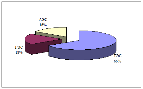 Электроэнергетика занимается производством электрической энергии, ее транспортировкой и распределением с помощью линий электропередач. Энергия производится на электростанциях разных типов, на некоторых станциях вместе с электрической производится также тепловая энергия. В России электроэнергия производится на электростанциях трех основных типов: тепловых (ТЭС), гидравлических (ГЭС) и атомных (АЭС). По производству электроэнергии Россия занимает четвертое место в мире после США, Японии и Китая. Структура производства энергии по типам станций показано на рис. 1.