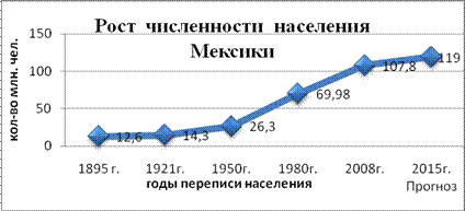 В последнее десятилетие Мексика переживает настоящий демографический врыв. В 2010 году численность населения Мексики по данным ООН составляла 112 468 855 человек (по данным 1-й переписи 1895 года, в Мексике проживало 12,6 млн. чел., в 1921 году — 14,3 млн., в 1950 году — 26,3 млн. чел., в 1980 году — 69 979 тыс. человек). По прогнозу в 2015 г. население составит 119 млн. чел (диаграмма, приложение 2).