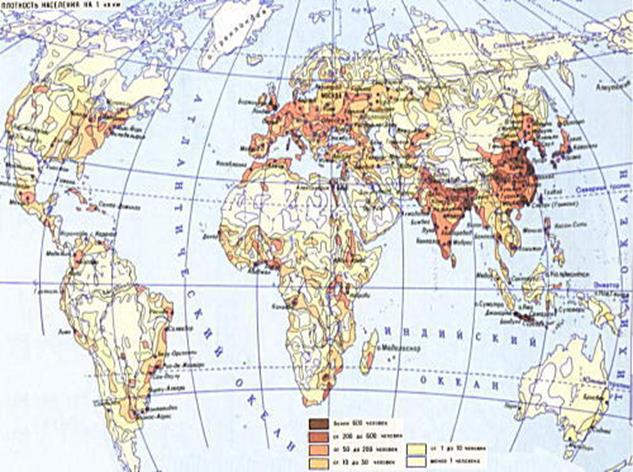 Средняя плотность населения Земли – 42 жителя на 1 кв. км. (Европа – 70 чел. на 1 кв.км, Азия – более 125 чел., Америка – 18 чел., Африка – 24 чел., Австралия и Океания – 4 чел.).