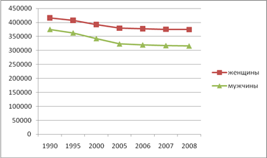 Основными причинами ухода из жизни являются болезни органов кровообращения, второй причиной стали травмы и насилие (16 % всех смертей). Анализируя данные таблицы 1.3, ожидаемая продолжительность жизни при рождении в период 2000-2008года увеличилась, этому способствовало улучшение жизни населения и совершенствование системы здравоохранения. 1990-е годы по всей стране характеризовались низкими демографическими показателями, в частности из-за перестраивавшейся политической обстановки в стране.