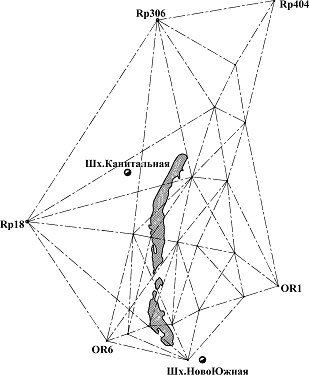 Рис. 1. Упрощенная (каркасная) схема деформационной сети шахты "Сарановская-Рудная"