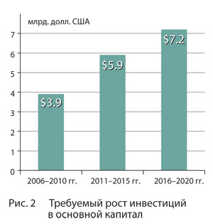 Однако ввод мощностей в приведенных объемах потребует значительных инвестиций в основной капитал, которые должны составить за период 2006-2020 гг. 16-17 млрд. долл. США. При этом в течение 2006-2010 гг. среднегодовой размер инвестиций должен составить 0.7-0.8 млрд. долл. США, в 2011-2015 гг. - 1.1-1.2 млрд. долл. США и в 2016-2020 гг. - 1.4-1.5 млрд. долл. США (рис. 2).