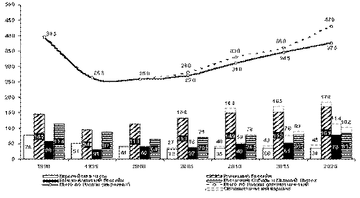 Возможности вложения в отечественную угольную промышленность таких значительных финансовых средств вызывают у некоторых специалистов сомнения, учитывая, что за последние 5 лет среднегодовые инвестиции в основной капитал в отрасли составили около 390 млн. долл. США. Поэтому не следует ожидать значительного роста добычи угля в перспективе. Так, например, эксперт из Великобритании Стивен Флук оценивает наиболее ожидаемый объем добычи угля в России к 2020 г. в размере не более 375 млн. т.(рис. 3)