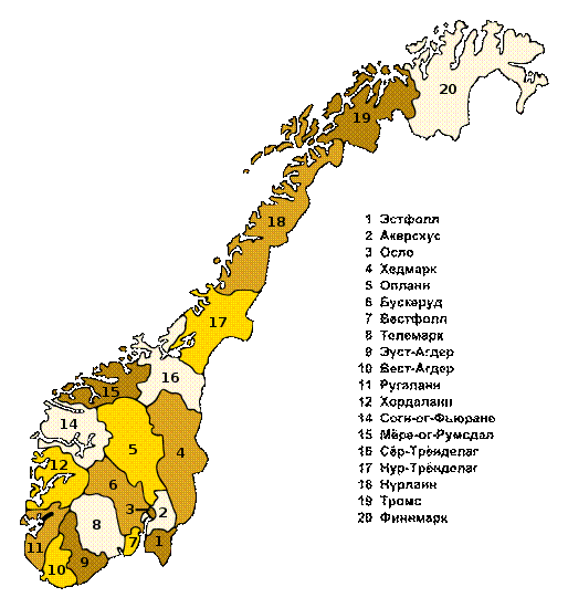 Норвегия подразделяется на 19 фюльке, которые объединяются в 5 основных неофициальных регионов: