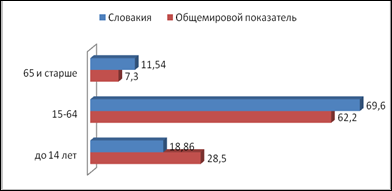 Для изучения возрастной структуры населения Словакии обратимся к рис. 2.1. Данные рис.2.1 указывают на то, что в возрастной структуре населения Словакии значительно меньше детей (т. е. до 14 лет), чем в мире в целом, однако доля трудоспособных людей выше общемировой на 7,4%.