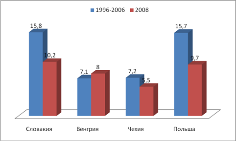 Рис. 2.3.1 Динамика уровня безработицы в Словакии, Венгрии, Чехии, Польше в 1996-2008 гг.
