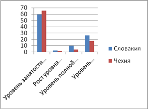 Сравним некоторые показатели трудовых ресурсов Словакии с аналогичными в Чехии. Данным рис. 2.3.2 указывают на то, что в Словакии значительно выше как уровень полной безработицы, так и уровень безработицы населения в возрасте от 15 до 24 лет. Следовательно, можно сделать вывод, что в Словакии решение социальных проблем, связанных с занятостью населения, находится на более низком уровне, чем в Чехии.