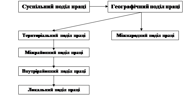 Територіальний поділ праці – це об’єктивний і безповоротний процес виробничої спеціалізації, відособлення економічних районів й розвитку міжрайонної кооперації, обміну спеціалізованою продукцією та послугами. Іншими словами, територіальний поділ праці можна розглядати як своєрідні системоутворюючі відношення в суспільно-географічному аналізі складної взаємодії усього народногосподарського комплексу та його складових частин (економічних районів, підрайонів, вузлів, центрів, пунктів).