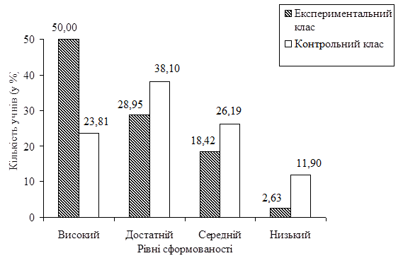 Аналіз даних діаграми свідчить, що кількісні показники наприкінці навчального року в експериментальному класі на всіх рівнях кращі, ніж у контрольному. Зокрема, високого рівня сформованості умінь працювати з географічними картами та оволодіння картографічними знаннями в експериментальному класі досягали 50,0 % учнів, що на 26,19 % більше, ніж у контрольному (23,81 %). Крім того, кількість учнів, які мають середній рівень сформованості рівнями сформованості умінь працювати з географічними картами та оволодіння картографічними знаннями, в експериментальному класі становить 18,42 %, а в контрольному — 26,19 %. Позитивним є також той факт, що в експериментальному класі низький рівень сформованості рівнями сформованості умінь працювати з географічними картами та оволодіння картографічними знаннями виявило 2,63 % учнів, тоді як у контрольному класі цей показник становив 11,90 %.