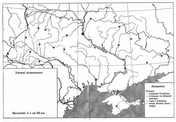 г) географічна карта, умовні знаки карти, масштаб карти, сторони горизонту на карті (визначення сторін горизонту на карті, визначення відстані на карті за масштабом, читання карти за умовними позначеннями, позначення деяких об’єктів Землі умовними позначеннями на контурній карті).