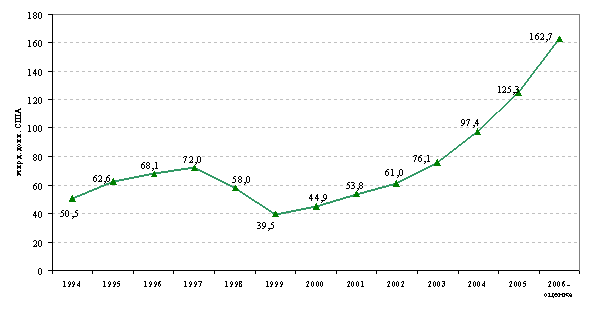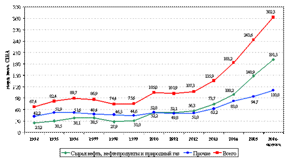 Впервые экспорт товаров превысил 300 млрд. долл. (рост на 24,1% против 32,9% в 2005 году). Падение темпов роста экспорта было обусловлено более медленным, чем годом ранее, повышением цен на топливно-энергетические товары – 28,4% и 44,9% соответственно.