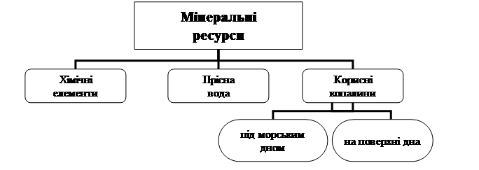 Світовий океан – великий природний резервуар, заповнений водою, яка являє собою складний розчин різноманітних хімічних елементів та сполук. Деякі з них видобуваються з води і використовуються у виробничій діяльності людини і, будучи компонентами сольового складу океанських та морських вод, можуть розглядатися як хімічні ресурси. Із 160 відомих хімічних елементів 70 знайдено в океанських і морських водах. Лише деяких з них концентрація перевищує 1 г/л. До них відносяться: хлористий магній, хлористий натрій, сіркокислий кальцій. Тільки 16 елементів знаходяться в океані у кількості понад 1 мг/л, склад решти вимірюється сотими і тисячними долями міліграму в літрі води. Через надто малі концентрації їх називають мікроелементами хімічного складу вод Світового океану. При дуже малих концентраціях речовин і елементів у 1 літрі океанської води їх склад досягає досить значних розмірів у порівняно великих об’ємах вод. У кожному кубічному кілометрі морської води розчинено 35 млн. тонн твердих речовин. Серед них кухонна сіль, магній, сірка, бром, алюміній, мідь, уран, се ребро, золото та інші.