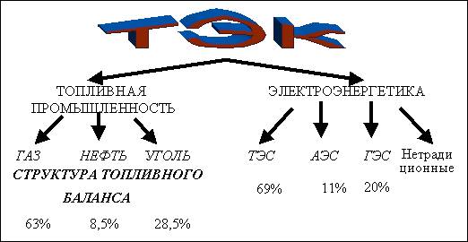 Все процессы добычи и переработки топлива, производства, транспортировки и распределения электроэнергии охватывает один из важнейших межотраслевых комплексов - топливно-энергетический комплекс (ТЭК). Он состоит из двух главных частей: топливной промышленности и электроэнергетики, а также инфраструктуры. Своеобразной особенностью ТЭК России является то, что он целиком базируется на отечественных ресурсах, по запасам которых страна занимает одно из первых мест в мире.