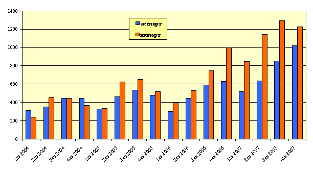Динамика экспортно-импортных операций участников ВЭД Ростовской области по кварталам 2004-2007 годов представлена на диаграмме: