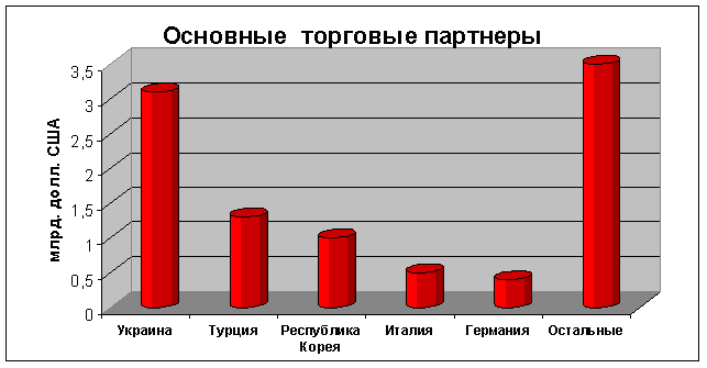Самым большим по величине был внешнеторговый оборот с Украиной (3,1 млрд. долл. США в 2008 году), Турцией (1,3 млрд. долл. США), Республикой Корея (1 млрд. долл. США), Италией (0,5 млрд. долл. США) и Германией (0,4 млрд. долл. США).