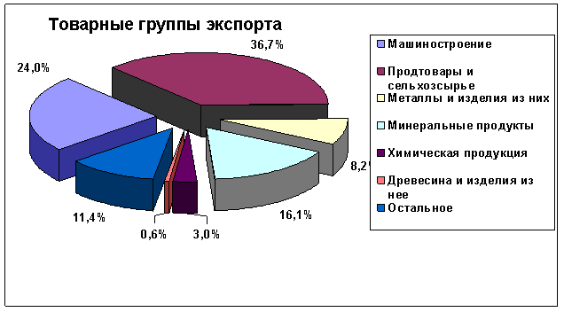 В целом товарная структура экспорта в 2009 году представлена продукцией следующих укрупненных групп товаров: продовольственные товары и сельхозсырье, машины, оборудование и транспортные средства, металлы и изделия из них, минеральные продукты, продукция химической промышленности.