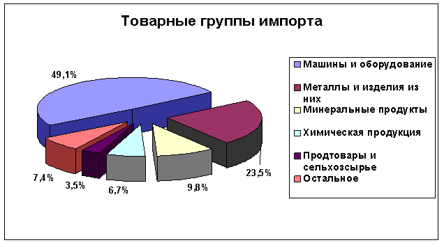 Структура импорта представлена продукцией следующих укрупненных групп товаров: машины и оборудование; металлы и изделия из них; продукция химической промышленности; минеральные продукты; продовольственные товары и сельхозсырье для их производства; древесина и целлюлозно-бумажные изделия, а также текстиль, текстильные изделия и обувь.