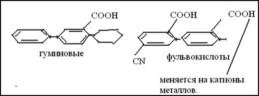 В составе гумуса фульвокислоты; мизерная емкость поглощения примерно до 5 мг/экв.