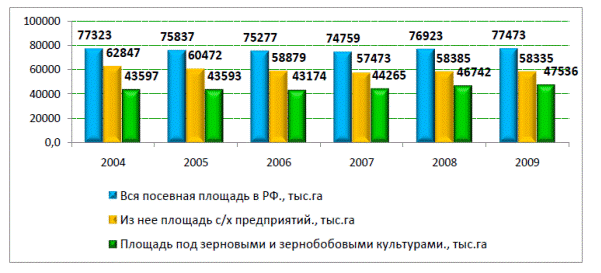 Общая посевная площадь в России в 2010 г составит 77,9 млн га, что на 395 тыс га больше 2009 г. (рис. 1).