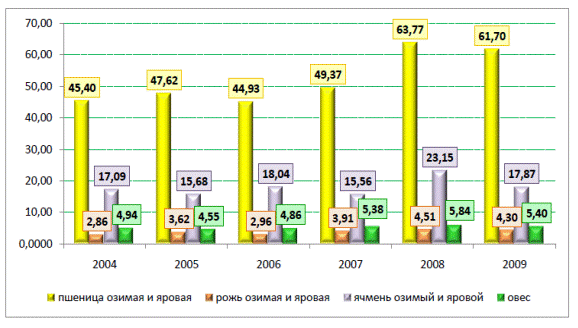 Рис. 2 Валовые сборы основных зерновых культур в РФ, в динамике