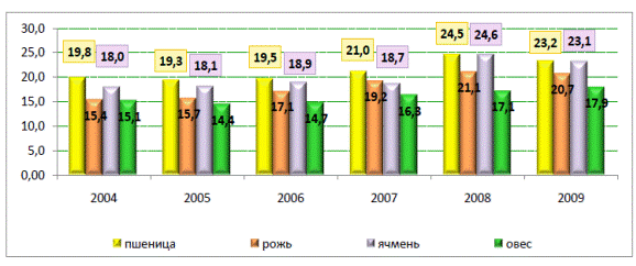 Среднегодовая урожайность зерновых в России в 2004-2009 гг. была на уровне 18 ц/га (в 3 раза меньше, чем в западноевропейских странах). Однако затраты на производство 1 ц. зерна у нас сравнительно небольшие, и оно более высокого качества (в частности благодаря твердым сортам пшеницы) (рис. 3).