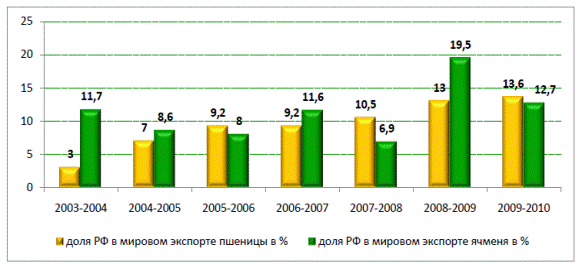 Доля РФ в мировой торговле зерном росла на протяжении 2003-2009 гг., однако в конце 2009-начале 2010 наблюдается существенное снижение, что связано с засухой и обострением мировой обстановки, связанной с глобальным финансовым кризисом (рис. 4).[5]