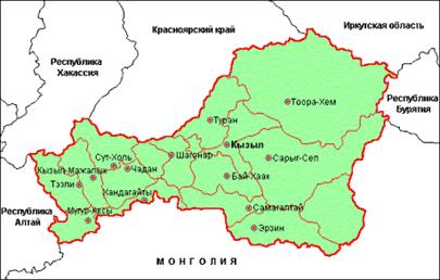 Тыва расположена в Центральной Азии, на юге Восточной Сибири, в верховьях реки Енисей. В городе Кызыле - столице республики - географическая точка Центра Азии. По югу и юго-востоку - государственная граница с Республикой Монголия (протяженность 1371,2 км), на востоке регион граничит с Республикой Бурятия, на северо-востоке - с Иркутской областью, на западе - с Республикой Алтай, на северо-западе и севере - с Республикой Хакасия и Красноярским краем.