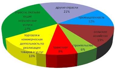Основу промышленно-производственного сектора экономики республики составляет сельское хозяйство (13%). Также в структуру валового регионального продукта наибольший вклад привносят торговля и коммерческая деятельность по реализации товаров и услуг, промышленность, строительство, транспорт (Рис.1).