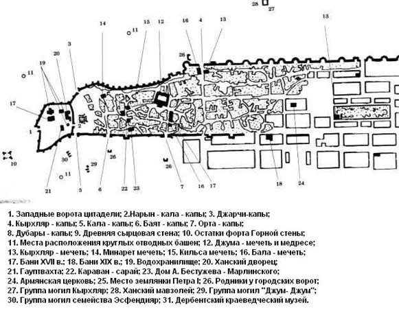 Джума – мечеть. Письменные источники сообщают о строительстве мечетей в Дербенте в различные периоды его истории, начиная с 8 в. Древнейшая из них, Джума-мечеть, представляет прямоугольное здание с выступом в центральной части южного фасада. Интерьер мечети представлен двумя основными частями: вытянутым в направлении восток-запад и квадратным подкупольным пространством. В северной стене мечети устроено четыре входа. Один из них, главный, расположен на поперечной оси здания и представляет собой выступающий из плоскости стены монументальный портал со стрельчатой арочной нишей и прямоугольным дверным проемом.