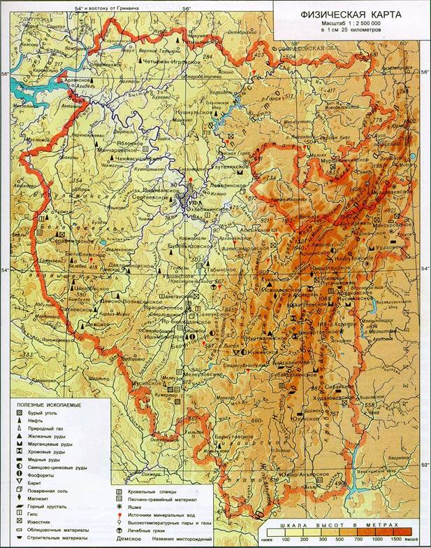 Район необыкновенно богат разнообразными полезными ископаемыми. Нефть и газ, месторождения калийных солей находятся в Предуральском краевом прогибе. Магматические породы восточных склонов содержат большие запасы железных, медных, никелевых руд. Кроме того, имеются залежи комплексной железной руды, содержащие также хром, титан, ванадий, месторождения асбеста, мрамора, талька, самоцветов (малахит, яшма, аметист). Но ресурсы Урала используются давно и интенсивно, поэтому они сильно истощены.