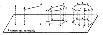 Рис.3 Горизонтальное проложение (изображение в плане) точки, прямой, ломаной и кривой линий.