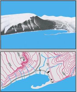 ГОРИЗОНТАЛИ, изображенные на карте внизу, используются для показа высоты местности по отношению к уровню моря. Это линии пересечения топографической поверхности, представленной на модели рельефа (верхний рисунок) воображаемыми горизонтальными плоскостями, расположенными с одинаковыми интервалами. Помимо того, что горизонтали указывают высоту поверхности, они позволяют судить о величине ее уклона (чем более сближены горизонтали, тем круче склон).