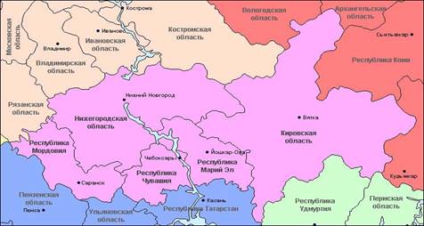 Волго-Вятский экономический район расположен в центральной части европейской территории России, в бассейнах рек Волги и Вятки, чем и объясняется его название. В состав района (рис. 2) входят Нижегородская, Кировская области, Республика Марий Эл, Республика Мордовия и Чувашская Республика. Географическое положение района отображено на рис.1.