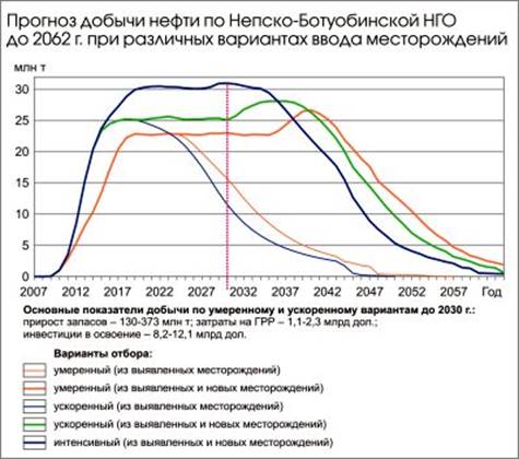 На сегодня все месторождения, выявленные здесь, способны обеспечить максимальные отборы нефти на уровне не более 22-23 млн тонн в год. В зависимости от интенсивности ввода их в освоение на пиковые уровни теоретически можно выйти к 2018г. и к 2015 г. соответственно. «Но при этом уже к 2030г. дефицит запасов из имеющихся на сегодня составит в годовом отборе от 8 до 14 млн т по сравнению с достигнутым уровнем. Для поддержания отборов нефти на заданном уровне для указанных вариантов уже к 2024 г. и 2019 г. соответственно должны быть подготовлены новые запасы из перспективной ресурсной базы, с тем, чтобы восполнить намечающийся к этому времени дефицит».[3]