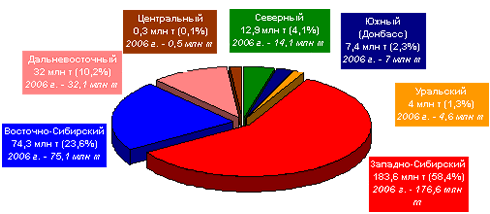Добыча угля по основным бассейнам в 2006-2007 гг., млн т