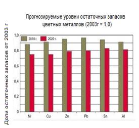 При прогнозе учтены исходное (на 2003г.) состояние МСБ цветных металлов, показатели динамики использования и воспроизводства запасов, текущая динамика состояния запасов и ресурсов, достигнутые и прогнози-руемые уровни производства и потребления, включая экспортно-импортные составляющие, а также сложившиеся тенденции распределения и исполь-зования фонда недр на лицензионной основе»[12] .