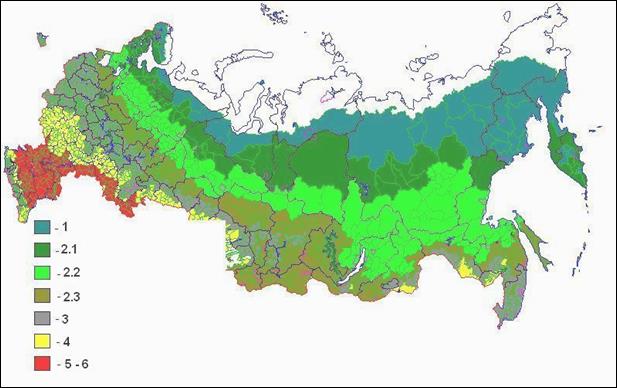 «По запасам почвенной влаги в России выделяют семь зон: 1) избыточного увлажнения (таежные районы); достаточного увлажнения (южнотаежные районы); 3) неустойчивого увлажнения (лесостепь Русской равнины и Западной Сибири); 4) недостаточного увлажнения (степи центрально-черноземных областей, Предкавказья и юга Западной Сибири); 5) засушливую (сухие степи Приазовья, Калмыкии и Заволжья); 6) крайне засушливую (полупустыня Прикаспия); 7) безводную (пустыня в низовьях Волги). В зонах неустойчивого и недостаточного увлажнения находятся 80 % пашни России. Ресурсы влаги в земледельческих районах нашей страны в 1,2 – 2 раза ниже, чем в странах Европы и США»[19] .