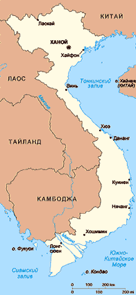 Вьетнам — страна в Юго-Восточной Азии, на полуострове Индокитай. С Востока Вьетнам омывается Южно-Китайским морем и его частью — заливом Бакбо, с Юго-Запада — Сиамским заливом. Площадь Вьетнама — 329.6 тыс. км2