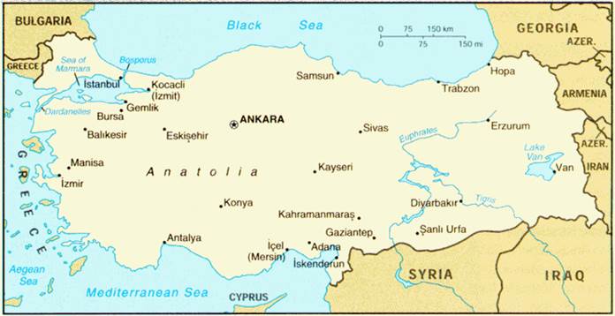 Страна расположена на западе Азии и крайнем юго-востоке Европы (см. карту). Граничит: с Грецией – на западе, с Болгарией, Грузией – на севере, с Арменией и Ираном – на востоке, с Сирией и Ираком – на юге. На севере омывается водами Черного моря, на юге – Средиземного, на западе – Эгейского. Мраморное море и проливы Босфор и Дарданеллы разделяют европейскую и азиатскую части страны.