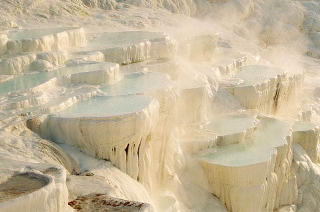 На территории Турции находится одно из чудес света - Памуккале, что переводится как "Хлопковый замок". Белоснежные известняковые террасы, образовавшиеся на протяжении тысячелетий благодаря охлаждению горячих кальциевых источников привлекают ценителей красоты, а минеральные воды террас оказывают благотворное влияние на здоровье, снимают напряжение и стресс.