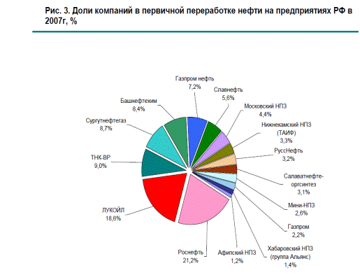 В 2008 г. 77,4% (182,8 млн тонн) всей переработки нефти осуществлялось НПЗ, входящими в состав вертикально-интегрированных нефтегазовых компаний, еще 22,5% (89,6 млн т) – независимыми переработчиками, на мини-НПЗ малых нефтяных компаний переработано менее 1%.