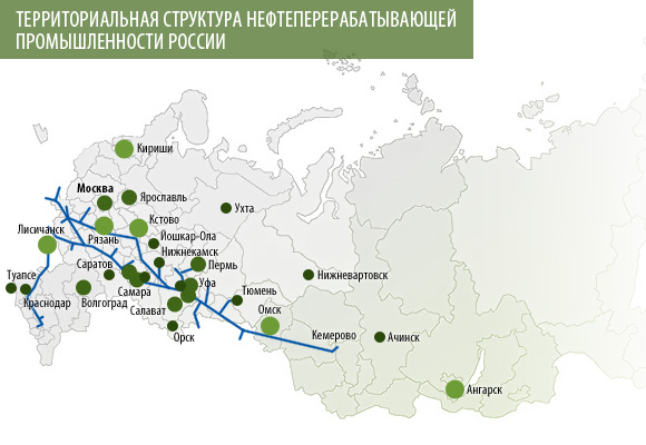 Нефтеперерабатывающие заводы разместились на трассах нефтепроводов (Нижний Новгород, Рязань, Москва, Кириши, Полоцк, Орск, Омск, Ангарск) , на водных путях (Волгоград, Саратов, Сызрань, Самара, Ярославль, Хабаровск) и в морских портах (Туапсе) , куда сейчас проложены трубопроводы. Поэтому удельных вес районов добычи нефти в ее переработке резко сокращается. В них сосредоточена еще значительная часть нефтеперерабатывающих заводов (Уфа, Салават, Ишимбай, Грозный) , идет интенсивная их реконструкция и зачастую расширение. Новых заводов в районах добычи нефти уже не строят. Они сооружаются на трассах нефтепроводов идущих на восток (Ачинск) . [10]