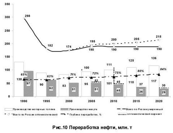 При всех вариантах развития, кроме критического, ожидается рост объемов переработки нефти .К 2010 году он может достигнуть 190 - 200 млн. т/год и к 2020 году - 190 - 215 млн. т/год с одновременным увеличением глубины переработки до 75 процентов в 2010 году и до 80 - 85 процентов к 2020 году. Объем производства моторных топлив (автомобильного бензина, дизельного топлива, авиакеросина) может увеличиться до 100 - 110 млн. т в 2010 году и до 115 - 135 млн. т в 2020 году. Выход светлых нефтепродуктов увеличится с 54 процентов в 2002 году до 66 - 68 процентов в 2020 году. При критическом варианте развития объем переработки нефти будет снижаться и может составить в 2020 году немногим более 170 млн. т.