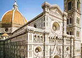Во Флоренции - собор Санта-Мария-дель-Фьоре (1296-1461) в готическом стиле, украшенный красным, зеленым и белым мрамором; колокольня XIV века; баптистерия Сан-Джованни (XI-XV веков), известная позолоченными бронзовыми дверьми, восточная дверь, украшенная скульптурными сценами из Ветхого Завета, называется "Райские Врата"; Национальный музей, в котором находится коллекция скульптур работы Донателло ; фонтан Нептуна (1576); палаццо Веккио (1299-1314); Галерея Уфицци - одна из величайших коллекций итальянских мастеров; галерея Питти с работами Рафаэля , Перуджино , Тициана , Тинторетто ; гробница семьи Медичи с мраморным барельефом работы Микеланджело; дворец Медичи-Рикардй (XV век), в котором расположен музей Медичи; монастырь Сан-Марино , в музее которого находятся работы Фра Анжелико и Фра Бартоломео, в нем же келья философа Савонаролы; галерея Академии изящных искусств, где хранится знаменитая скульптура работы Микеланджело - Давид; Археологический музей; францисканская церковь Санта-Гроче (XIII-XIV века), расписанная Джотто, ее называют Пантеон Флоренции, так как в ней похоронены Микеланджело Буонаротти, философ и политический деятель Николо Маккиавелли, композитор Россини.