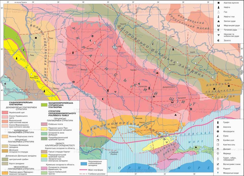 Платформы. Наибольшей тектонической структурой, лежащей в основе территории Украины, есть давняя Восточноевропейская платформа . Ее фундамент составляют докембрийские кристаллические породы (граниты, базальты, гнейсы, кристаллические сланцы, лабрадориты, кварциты). На платформе возвышается Украинский щит . Это одна из древнейших участков земной коры в Европе. Кристаллический фундамент перекрыт здесь незначительной (Несколько десятков метров) толщей осадочных отложений, а во многих местах докембрийские породы выходят на земную поверхность. Щит полосой шириной 250 км простирается почти на 1 000 км вдоль правого берега Днепра и выходит к Азовскому морю. Древними глубинными разломами щит разбит на крупные блоки.
