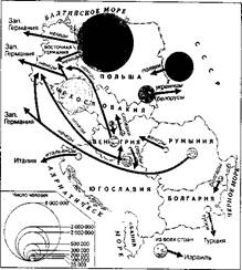 Вторая мировая война и связанные с нею изменения в политическом строе многих государств и в их границах привели, прежде всего к массовым перемещениям населения между самими европейскими странами. В первую очередь это коснулось Восточной Европы (рис.1). Как нетрудно заметить, наиболее многолюдные миграции в субрегионе были связаны с массовым вселением немцев Германию из других стран. Из них на территории Западной Германии осело 7,4 млн., Восточной – 4,3 млн. человек. Для Западной Европы в первый послевоенный период наиболее характерной была массовая репатриация людей из бывших колоний Великобритании, Франции, Нидерландов, Бельгии. Например, из Алжира во Францию возвратилось не менее 1 млн. французов, из Индонезии в Нидерланды – 300 тыс. голландцев. Однако до середины 1950-х гг. Западная Европа имела еще отрицательное сальдо миграций, т.е. эмиграция превосходила иммиграцию.
