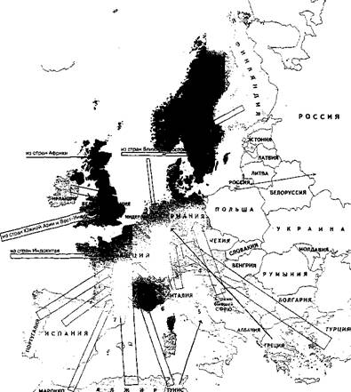 Рис. 14. Основные потоки внешних миграций в Западной Европе после Второй мировой войны (по Ю. Н. Матвееву)